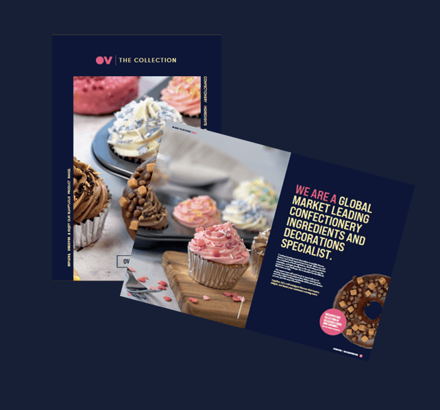 The brochure showcases OV’s wide range of confectionery ingredients and decorations, including fudge, sprinkles, inclusions and marshmallows. It highlights how OV supports retail, food service and industrial manufacturers with innovative solutions, expert support and high production standards.