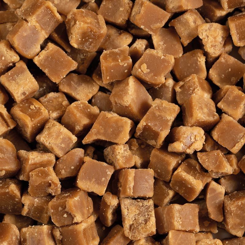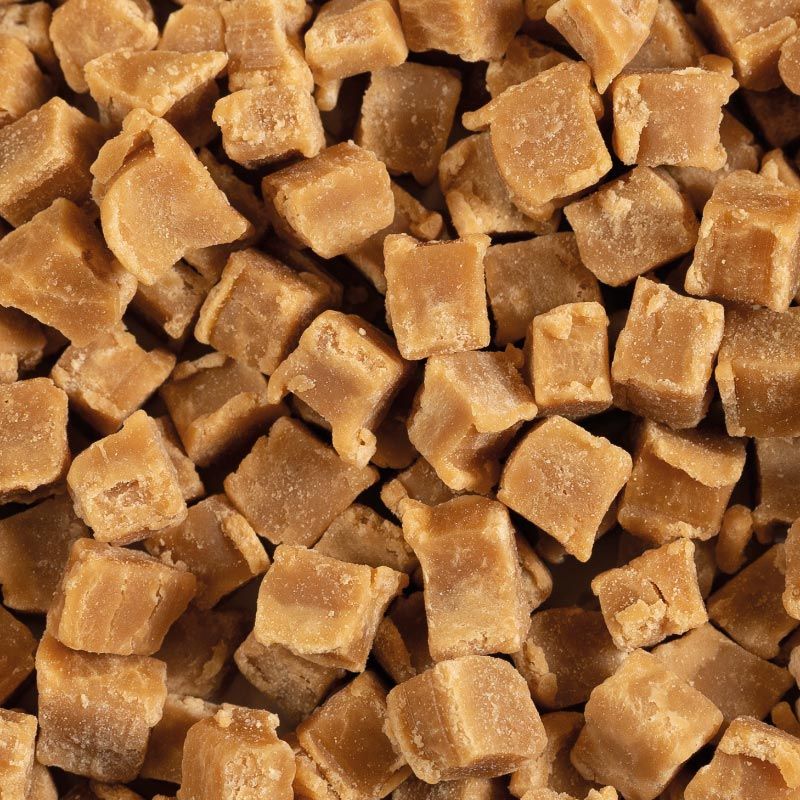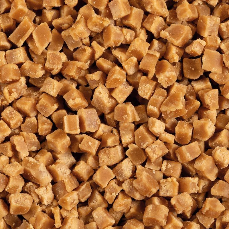Golden brown pieces of fudge with caramel flavour. The product is bake-resistant (also referred to as bake stable in some markets)