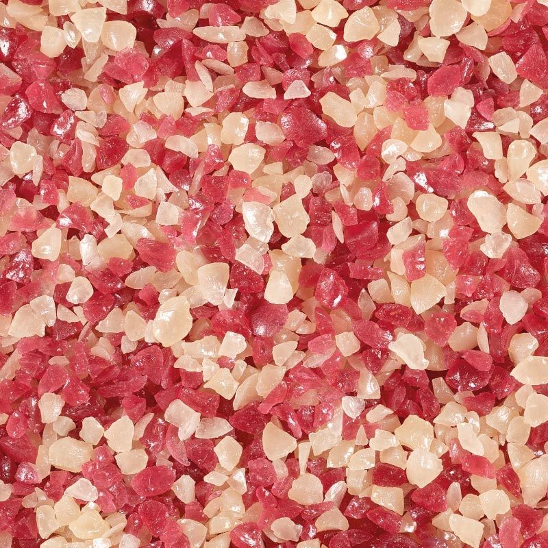 Red and white pieces of chopped hard boiled candy with mint