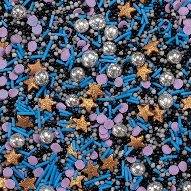 Black and silver 00's & 000's, dark blue strands, silver crispy chocolate pearls, gold stars, and purple confetti. Please note that the MOQ can vary for market to market, please contact your local OV representative for details.