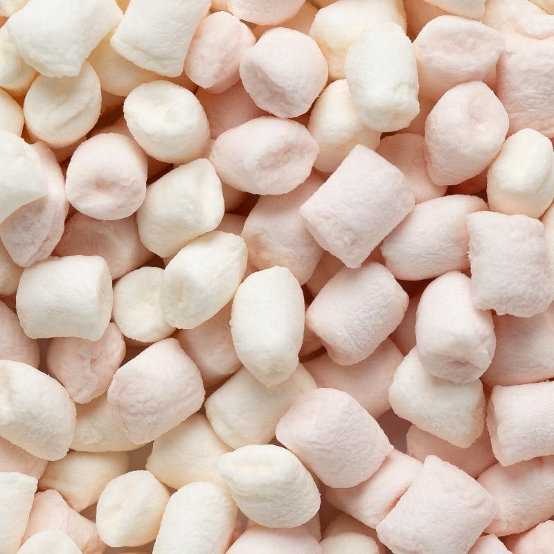 Fluffy & soft, pink & white coloured micro mallows (beef gelatine)