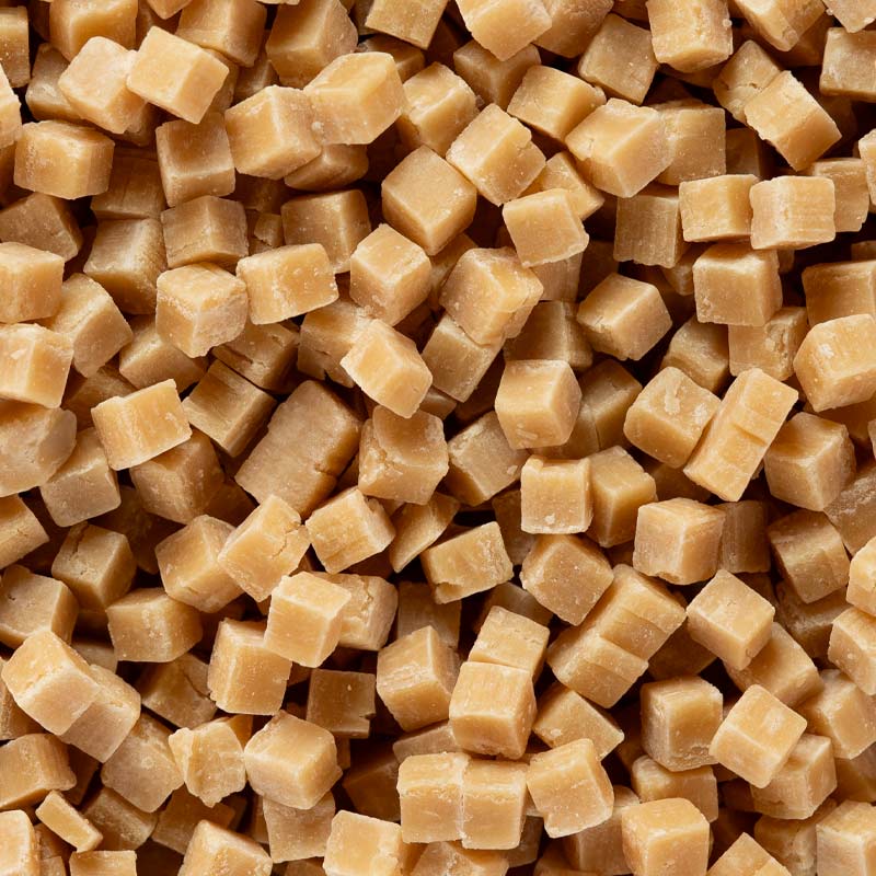 Golden brown coloured pieces of soft plant based fudge with caramel flavour