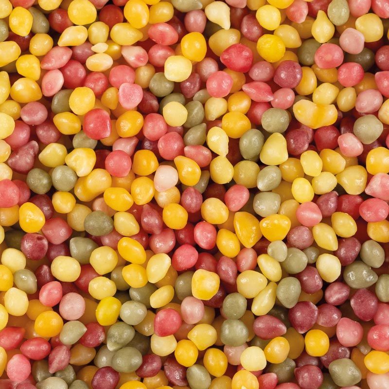 Pink, purple, orange, yellow and green pieces of fudge with tutti frutti flavour.