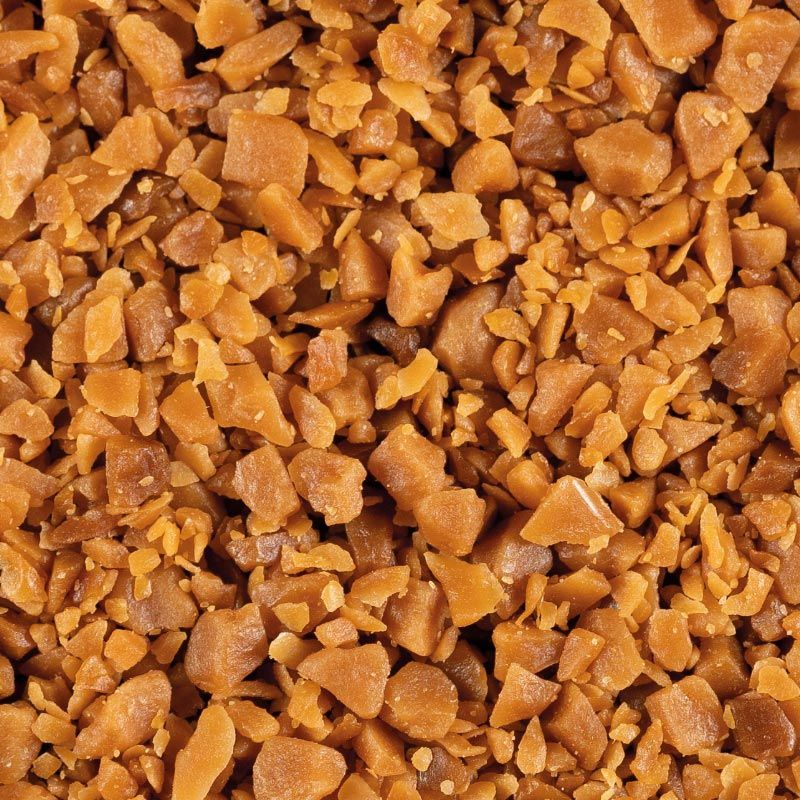 Golden brown toffee pieces with toffee flavour. The product is bake-resistant (also referred to as bake stable in some markets).