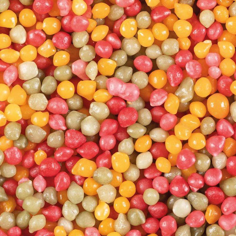 Orange, green and red chewy chips with tutti frutti flavour