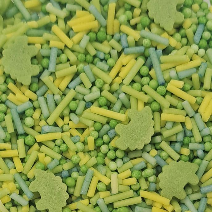 Green dinasaur sugar shapes, green & yellow strands and hundreds and thousands. Please note that the MOQ can vary for market to market, please contact your local OV representative for details.